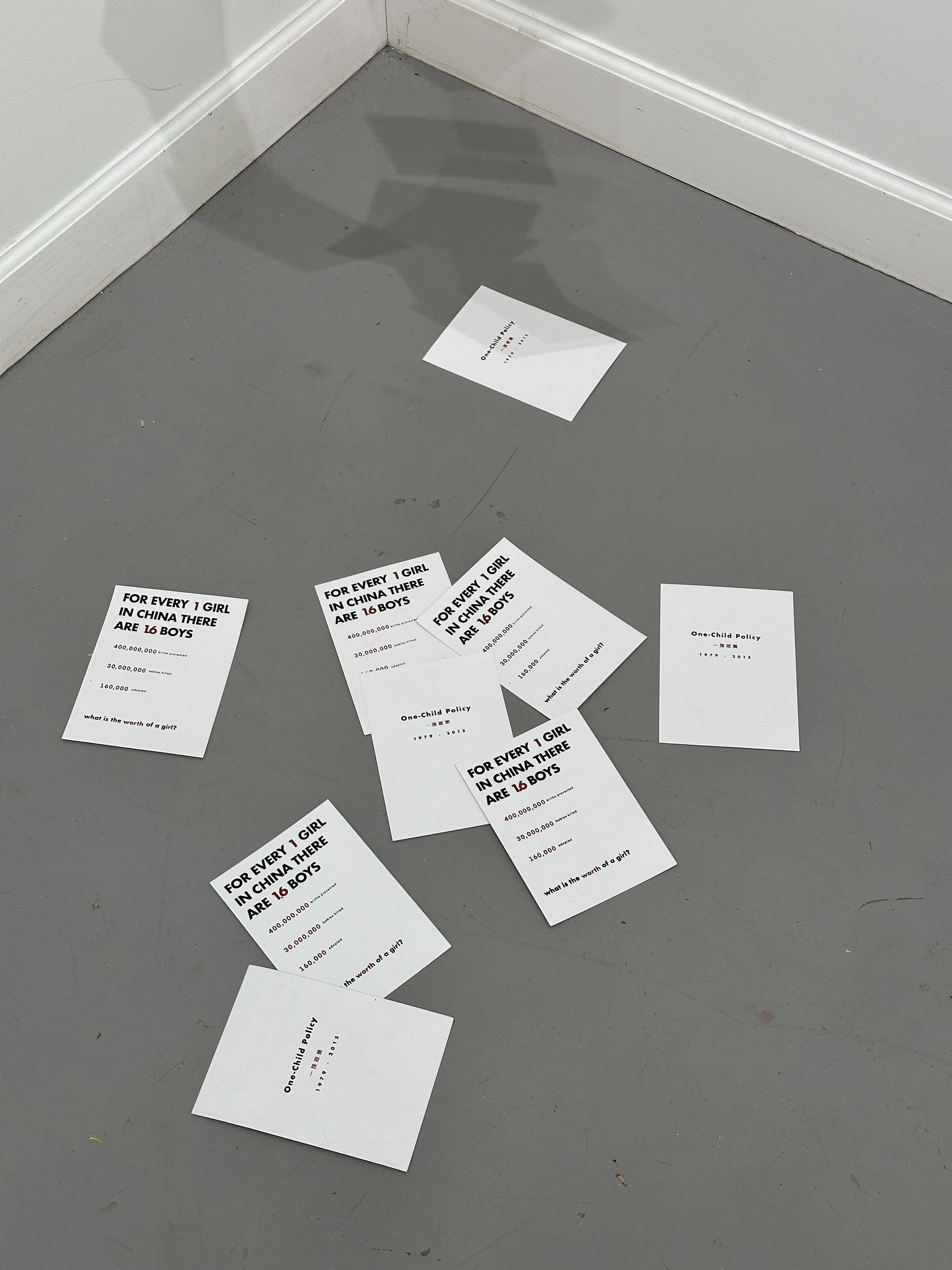 During the Tiananmen Square Massacre in 1989, the Chinese government dropped pamphlets from helicopters, urging the protesters to leave the square. There is something incredibly visceral about falling paper, many times in wartime or conflict, pamphlets are used or dropped on people. In this piece I screen printed pamphlets the statistics of the One Child Policy and hung them with fishing line to make it reminiscent of the falling pamphlets used in the past.